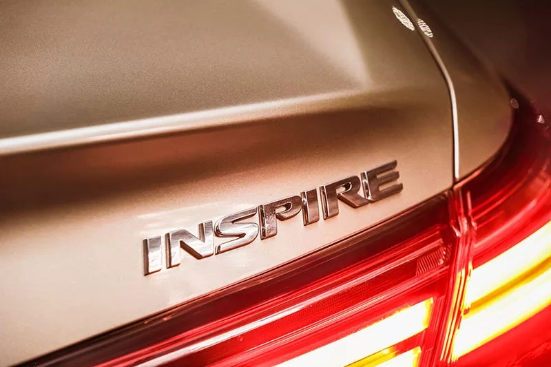 當然漂亮的前臉還離不開(kāi)大燈的畫(huà)龍點(diǎn)睛,由6近光+3遠光共計9顆LED燈珠組成的全LED燈組像陣列般排開(kāi),無(wú)論是白天還是夜晚都讓INSPIRE更加顯目。如果你按下雙閃或者撥動(dòng)轉向燈桿,就會(huì )發(fā)現INSPIRE采用了流動(dòng)式轉向燈設計,隨著(zhù)燈帶的流動(dòng)科技感也隨之上升。來(lái)到尾部,紅色的尾燈組讓INSPIRE顯得動(dòng)感十足,翹起的小尾翼以及雙邊共雙出的排氣也都為運動(dòng)風(fēng)格的營(yíng)造做出了貢獻??偟膩?lái)說(shuō),INSPIRE的外觀(guān)極具魅力,時(shí)尚而不張揚,在細節處又營(yíng)造了恰到好處的運動(dòng)風(fēng)格。尤其我們的試駕車(chē)還采用了金色車(chē)漆,更是平添了旗艦質(zhì)感。