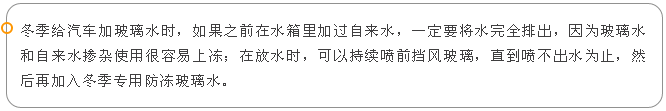 如果太陽(yáng)曬不開(kāi),也可以在玻璃水水箱中加一些溫水(不可以加開(kāi)水),待化開(kāi)玻璃水后,盡快將水排出,以免再次凍住,然后加入冬季專(zhuān)用玻璃水。